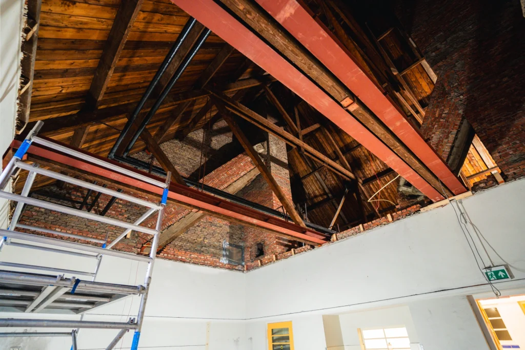 - Een totale uitbreiding van 400 m² gebruiksoppervlak door het plaatsen van een nieuwe verdiepingsvloer in de huidige kapconstructie. Deze extra verdiepingsvloer is gerealiseerd doormiddel van een staalconstructie.